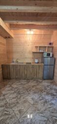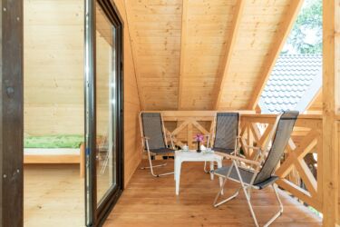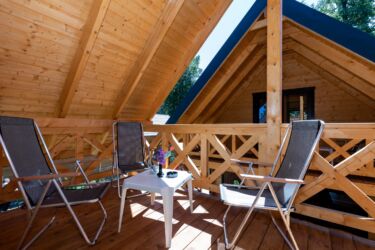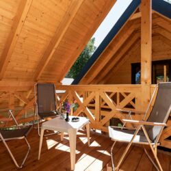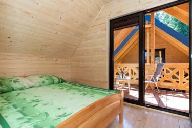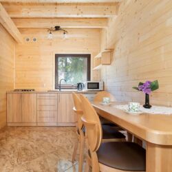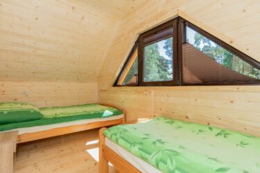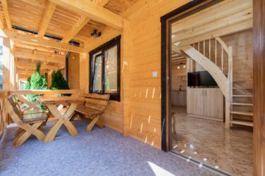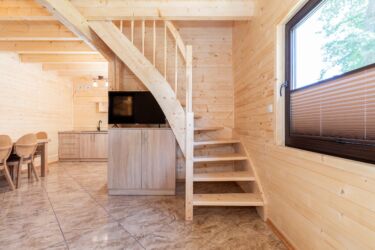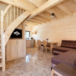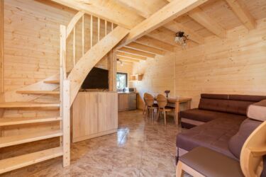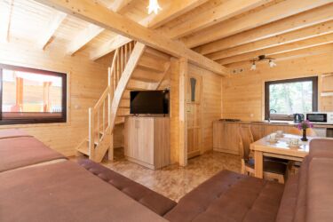 Wszystkie domki posiadają 2 sypialnie oddzielne na górze i salon z aneksem kuchennym.