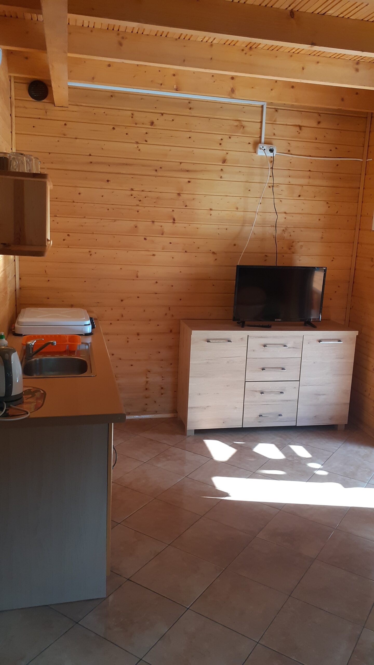 Wszystkie domki posiadają 2 sypialnie oddzielne na górze i salon z aneksem kuchennym.